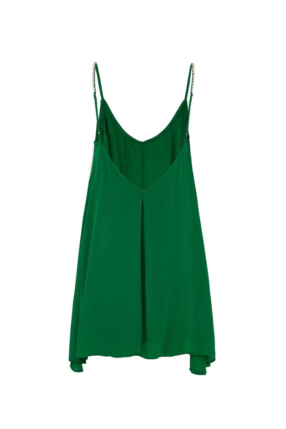 A sleek, lightweight slip dress crafted from soft vegan silk with a fluid, glossy drape. The open back adds a refined touch, while pearl-trimmed adjustable straps elevate the minimalist silhouette.