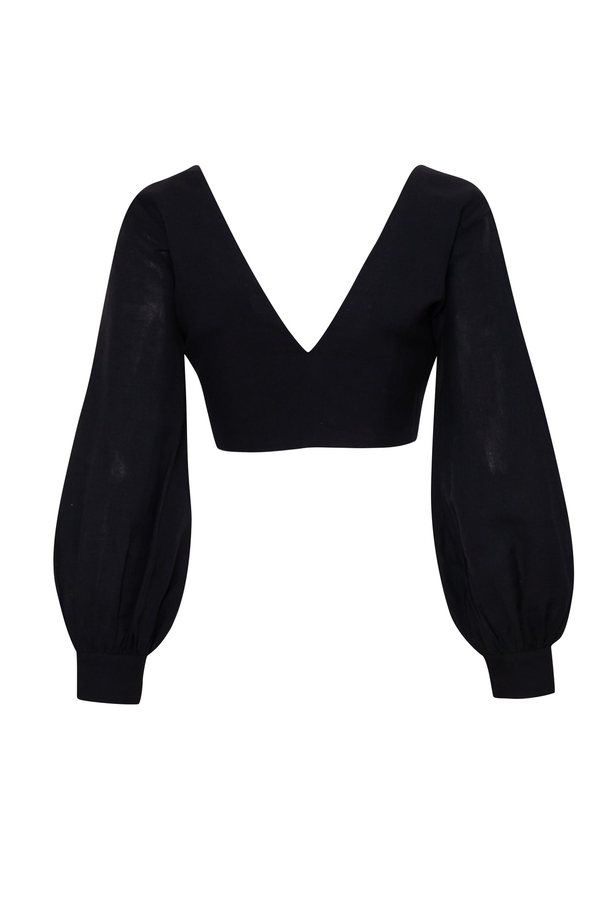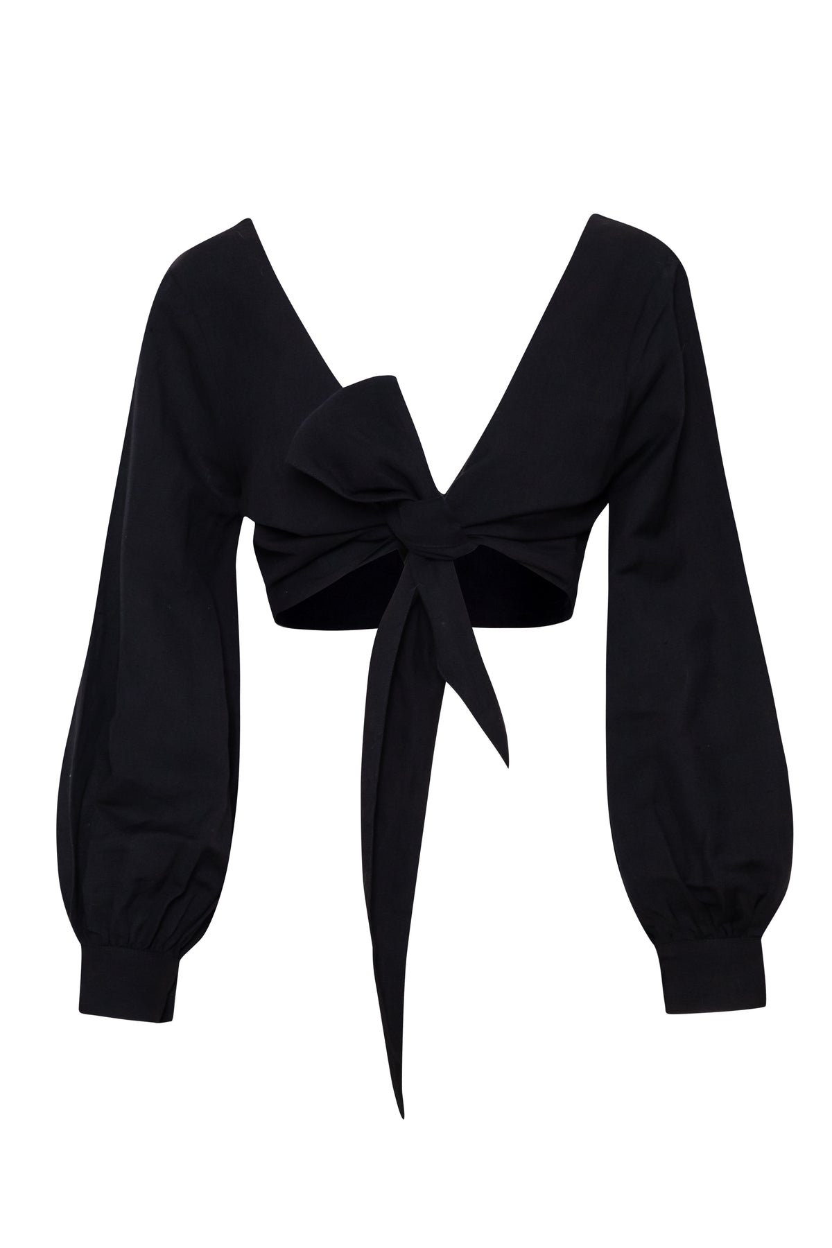 A breathable, crop top crafted from 100% linen. Designed with a deep V neckline, full sleeves, and an adjustable front tie that lets you customize your fit. Lightweight, comfortable, and easy to style with high-waisted pants, skirts, or denim.