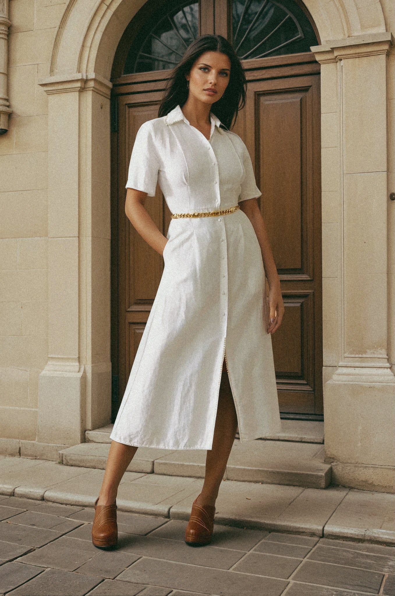 A timeless warm-weather staple elevated with delicate pearl details. This linen shirt dress features flutter sleeves, a button-down front, and a removable waist tie that lets you define your shape. Subtle pearl trimming along the collar, sleeves, and hem adds an elegant touch while keeping the look effortless and refined.