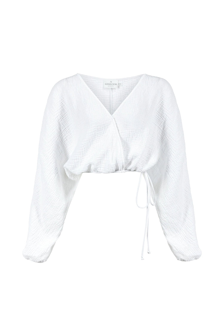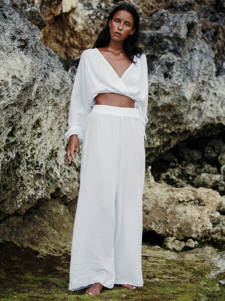 Elevate your summer wardrobe with the Siena top in crisp white. The cross-front drape exudes romance while the flowing, double layered gauze cotton adds an effortless, breezy feel. Its adjustable drawstring waistband and wide sleeves make it perfect for warm weather strolls. One size fits most, making it a versatile addition to your wardrobe. Garment care instructions included for easy maintenance.