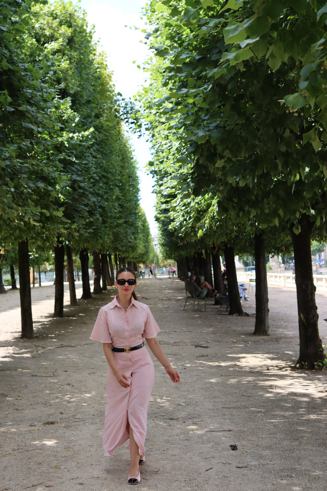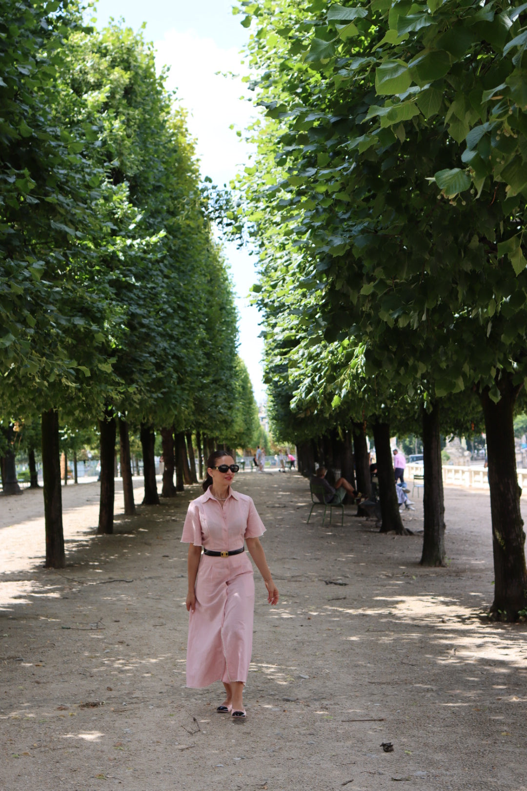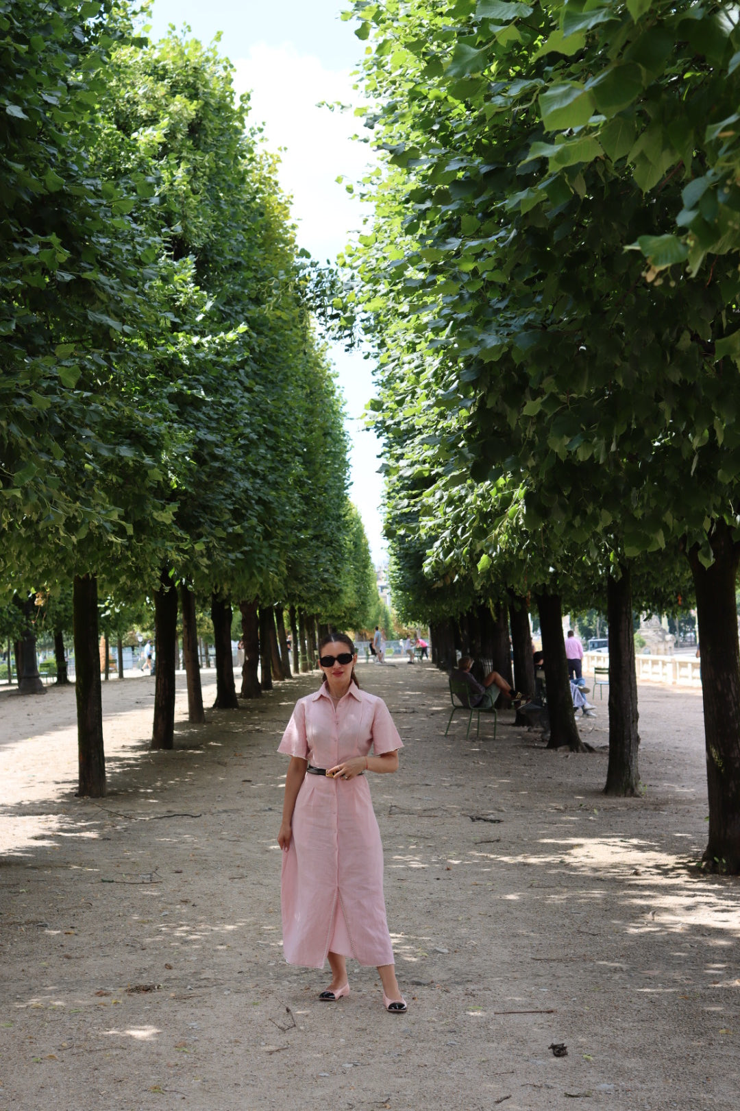 A classic button-down midi dress crafted from 100% linen. Designed with flutter sleeves, a removable waist tie, and contrast of pearls rim along the collar, sleeves, and hem. Lightweight, breathable, and easy to wear from day to night.