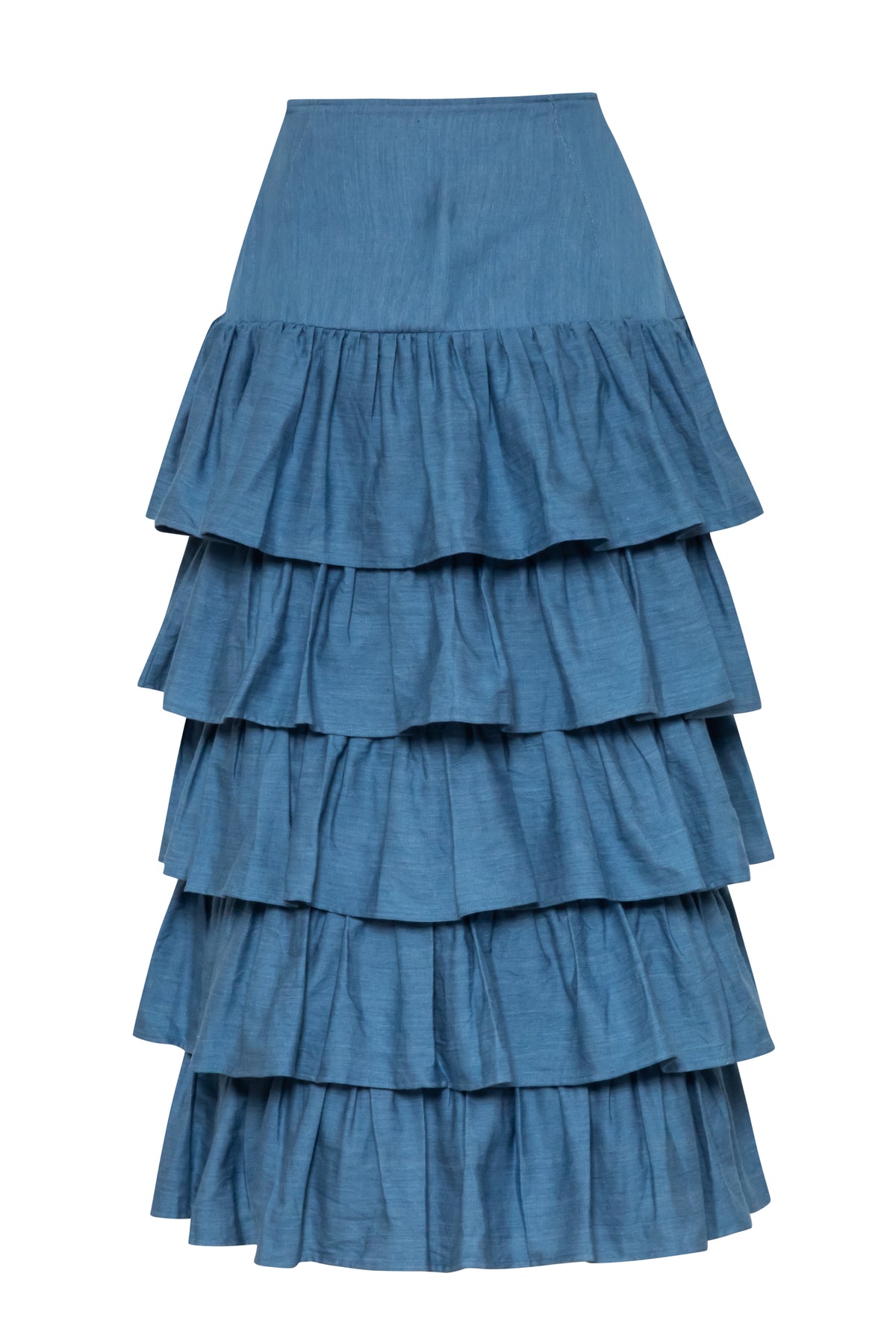 A statement skirt crafted in handloomed denim with cascading tiered ruffles that create beautiful movement and volume. Designed to sit at the waist for a flattering, feminine silhouette.